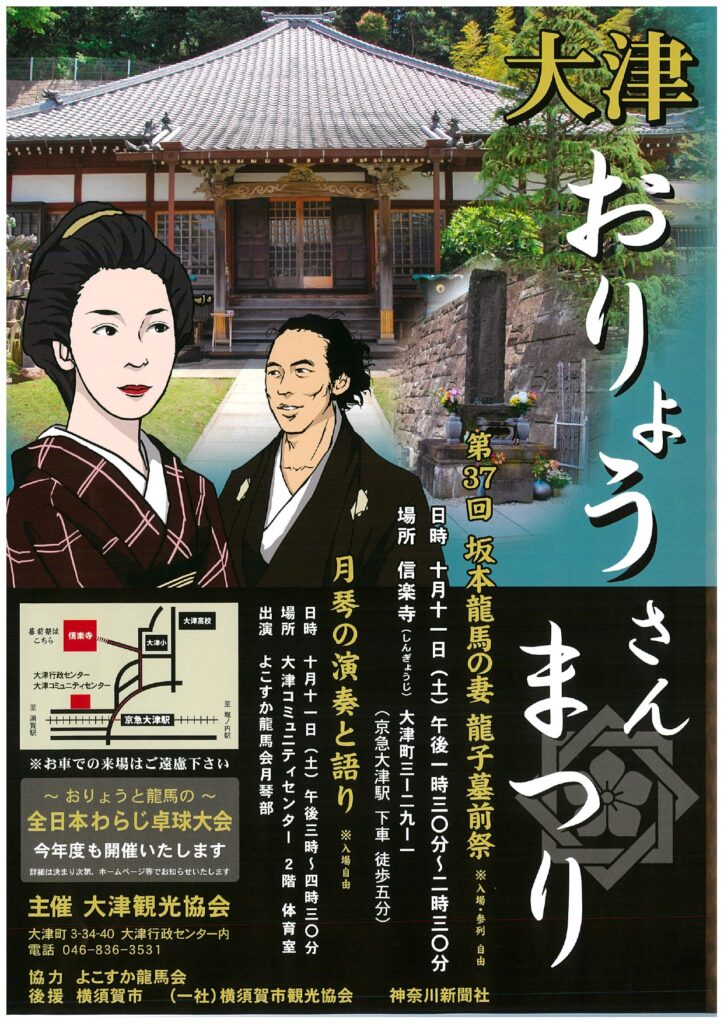 人生の後半生33年間を横須賀で過ごしたおりょうのお墓は、大津信楽寺(しんぎょうじ)にあり、毎年秋にはおりょうさんを偲び墓前祭が開催されます。また大津コミュニティセンターでは月琴(げっきん)の演奏会が開かれます。