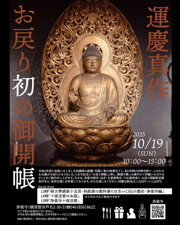 浄楽寺十夜法要に際し、また、仏像が横須賀市美術館からお戻りになったことを記念し秋の運慶仏お戻り御開帳を行い、西地区の活性化を目指します。