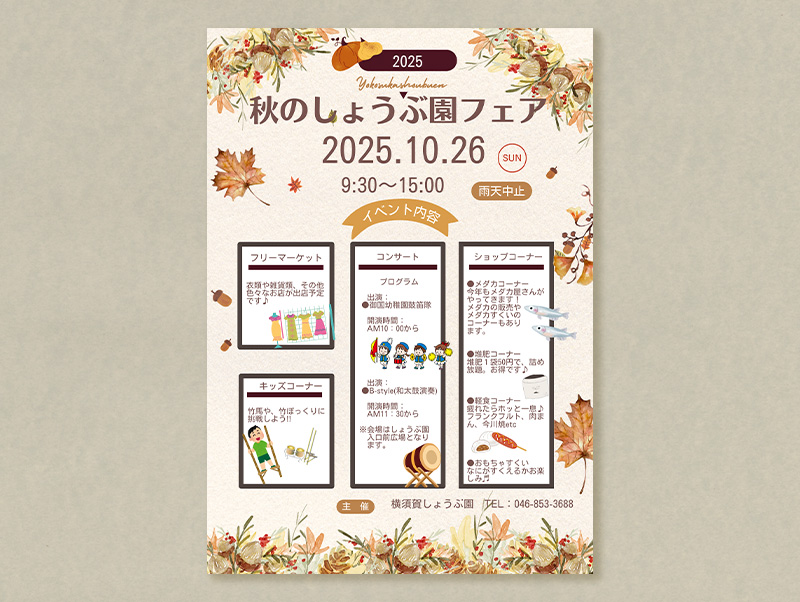秋のしょうぶ園フェアは雨天予報により中止とさせていただくこととなりましたので、お知らせいたします。