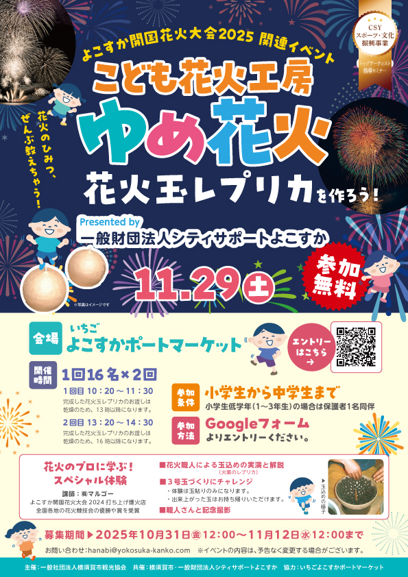 よこすか開国花火大会2025関連イベント。全国の花火大会で受賞歴を誇る株式会社マルゴーの花火職人による特別ワークショップ!花火の魅力を「見る・作る・学ぶ」体験型イベントです。