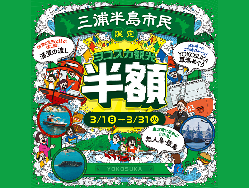三浦半島にお住まいの方限定で、「YOKOSUKA軍港めぐり」「無人島・猿島」「浦賀の渡し」の3航路の乗船料が半額になるキャンペーンが始まります!