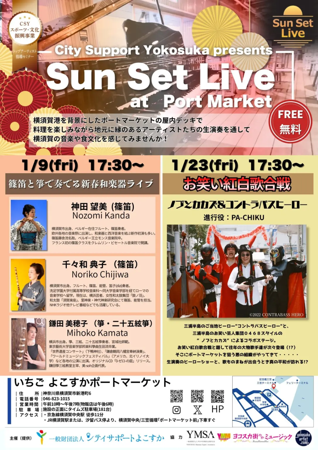 横須賀港を背景にしたポートマーケットの屋内デッキで料理を楽しみながら、地元に縁のあるアーティストたちの生演奏を通して横須賀の音楽や食文化を感じてみませんか!
