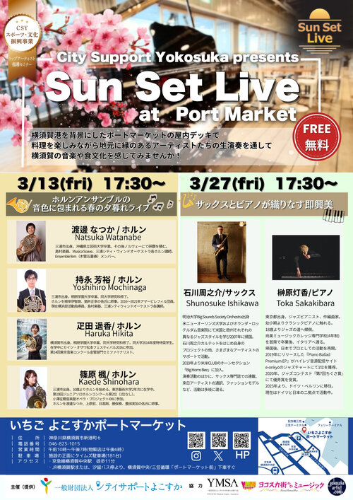 横須賀港を背景にしたポートマーケットの屋内デッキで料理を楽しみながら地元に縁のあるアーティストたちの生演奏を通して横須賀の音楽や食文化を感じてみませんか!