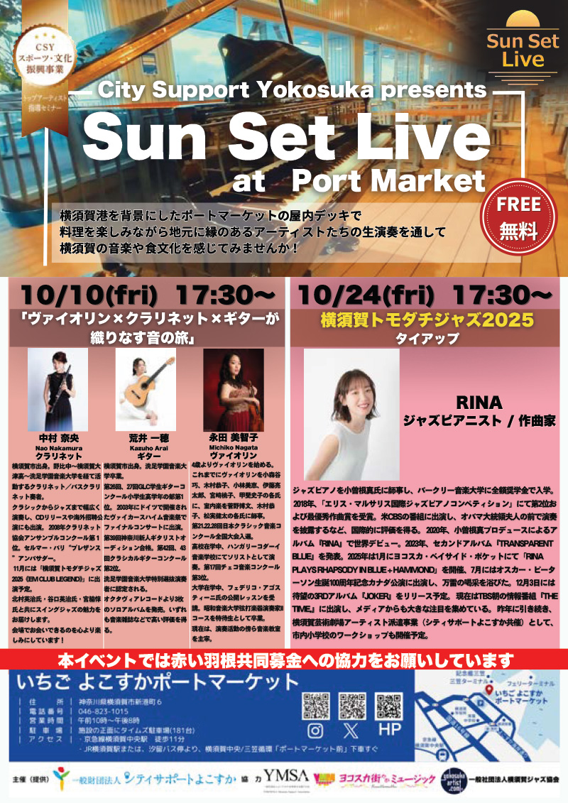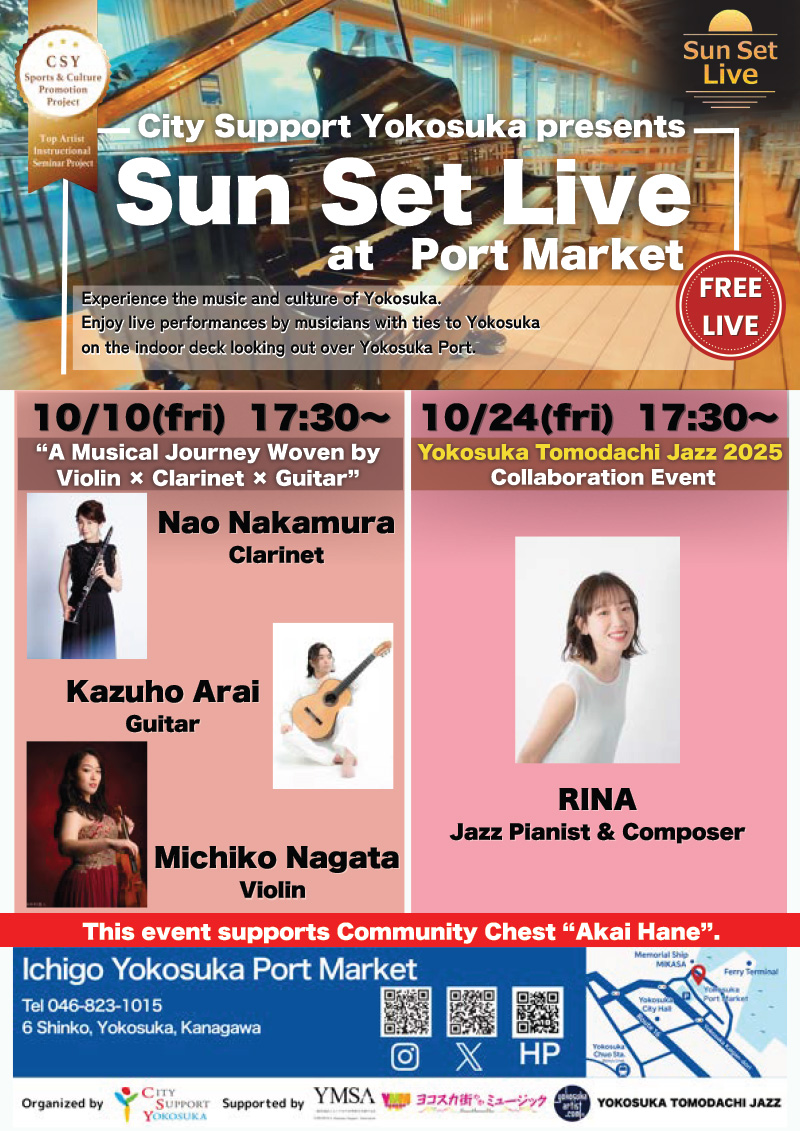 横須賀港を背景にしたポートマーケットの屋内デッキで料理を楽しみながら地元に縁のあるアーティストたちの生演奏を通して横須賀の音楽や食文化を感じてみませんか!