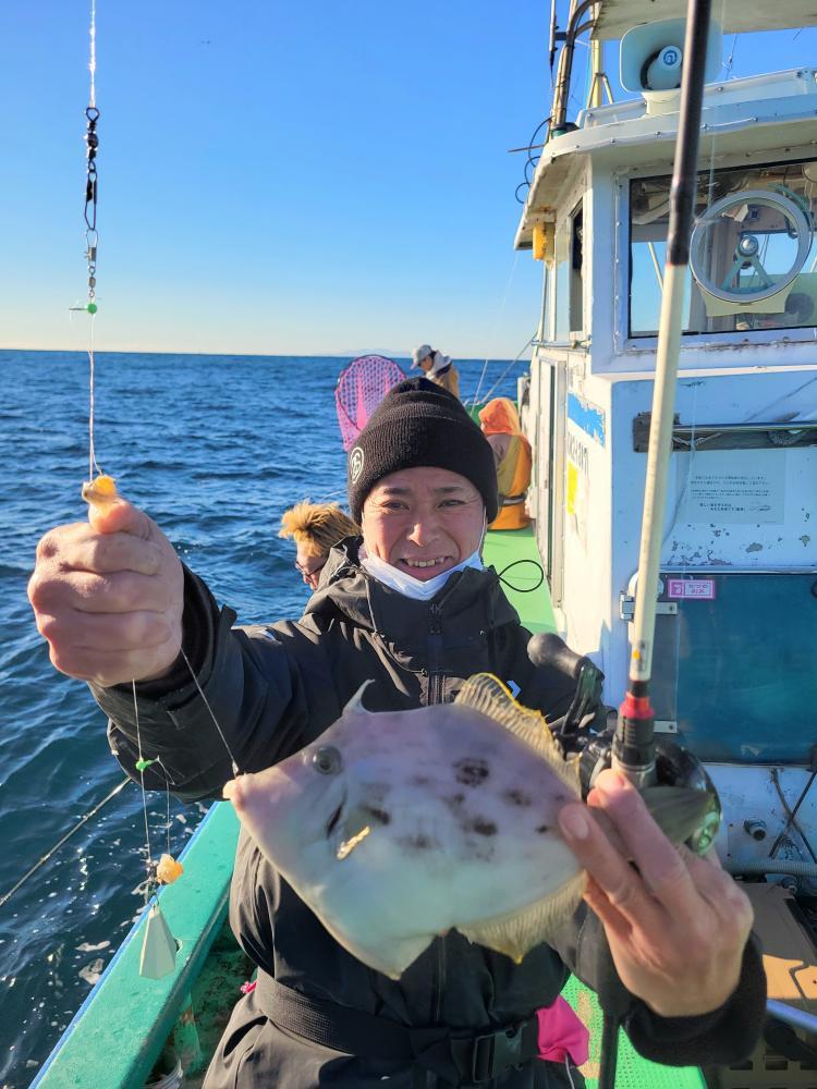 カワハギ2番手7匹。今日は序盤が潮が良い感じで流れて好調でした、3人同時ヒットなどもありました。後半にかけては潮がゆっくりとなりアタリ少なくなってしまいました。本日はありがとうございました。 【天候情報】 水深15M~30M 水温:- 潮色と流れ:澄み ゆるい 風向きと強さ:北西 弱い 波高:0-0.5M 天候:晴れ 【釣果情報】 カワハギ 15-27 cm 3-10 枚